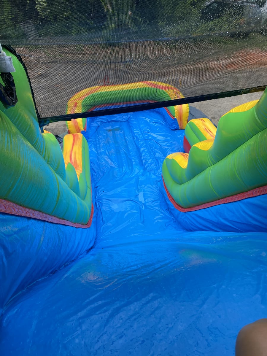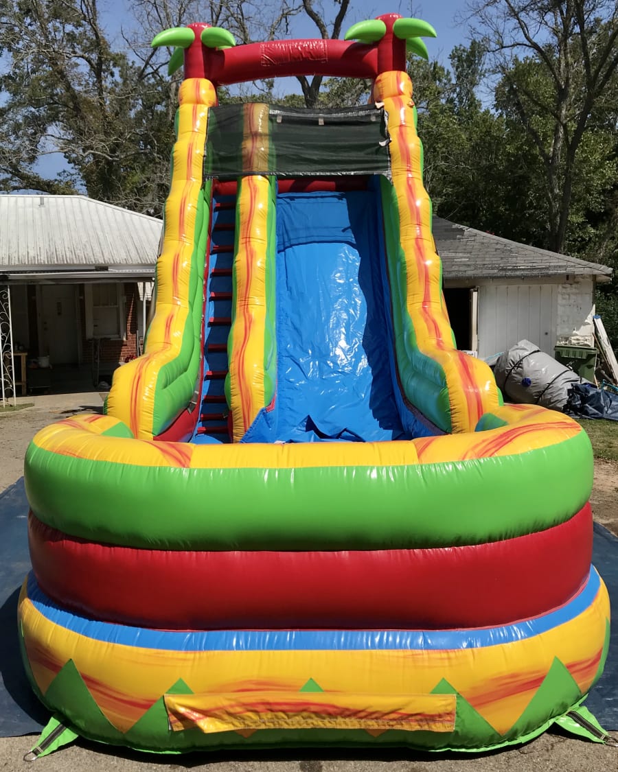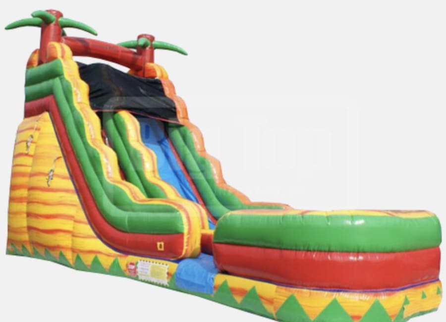 Turn your backyard into a tropical paradise with our vibrant 19" Palm Tree Water Slide! with 29" long with splash pad in the bottom This colorful inflatable slide features a towering palm tree at the top, adding an exciting tropical touch to your event. With its refreshing yellow, green, and red theme, this water slide brings the essence of a tropical escape right to your doorstep.